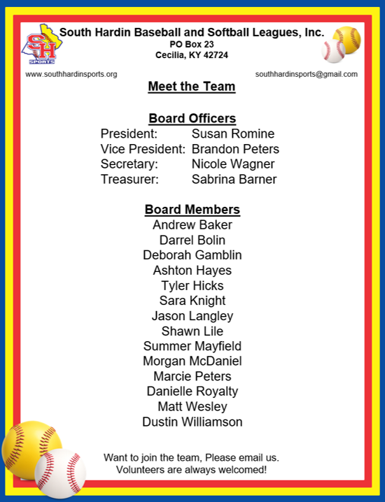 South Hardin Baseball & Softball Contact us [email protected]. We monitor our email 24/7!, P.O. Box 23Cecilia, Kentucky 42724